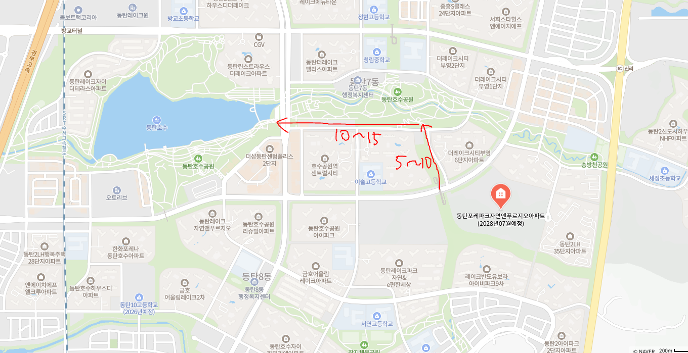 실제 사진은 없지만, 동탄포레파크자연앤푸르지오에서 호수공원 쪽으로 걸어가는데 대략적으로 5~10분, 호수공원 쪽 도착해서 호수 쪽으로 가는 데에 10~15분 정도 걸릴 것 같았습니다.