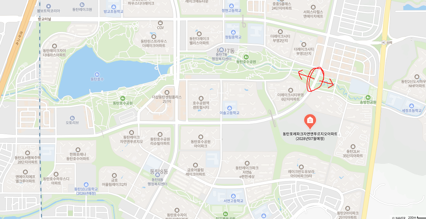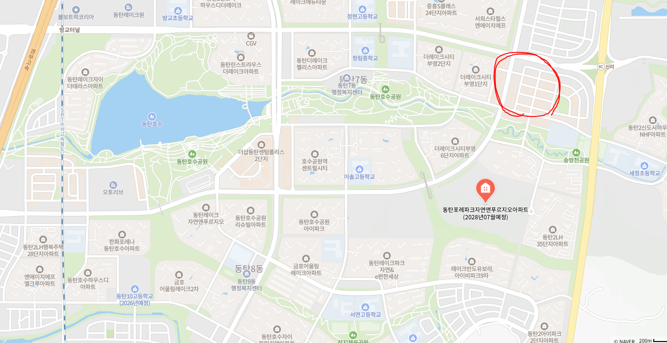 동탄 포레파크 자연앤 푸르지오 아파트의 위치는 다음과 같고, 동탄호수공원과는 거리가 조금 있습니다.